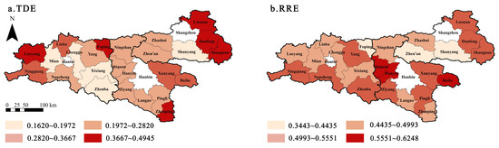 From the box plot in Figure 4b, the median of RDE was 1.6673 in the period from 2013 to 2018, which was greater than that of TDE, 1.2746, indicating that the development of tourism lagged behind the rural restructuring. Moreover, the box height of RRE was shorter than that of TDE, revealing that the gap of RRE among counties was smaller. According to the distribution map in Figure 6, the number of high-value areas (high-level + extremely high-level) of TDE was less than that of low-value areas (low-level + extremely low-level), which accounted for only 40% of the total area and were scattered at the edge of the area. RRE has nearly equal amounts of low-value and high-value areas, with the majority of the former being concentrated in the Qinling Mountains.
