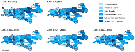 The distribution map (Figure 8a,b) demonstrates that it was still dominated by primary coordination counties in 2018 despite an increase in coordinated counties from 60 to 84 percent. In addition, the average coordination degree in the west was lower than that in the east both in 2013 and 2018, and there were more variations of coordination types and a greater level of disparity in the west than in the east. As shown in Figure 8c–e, the primary coordination counties were also dominated in the relationships between TDL and RDL(e), RDL(so), and RDL(sp).