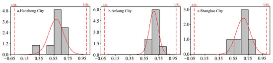 In addition, Ankang faces a relatively singular problem compared to the other two cities. We introduced the Cpk (process capability index) from industrial production to reflect the discrepancy in SDP among counties in their respective city. The specific relationship of Cpk is Ankang (1.757) > Hanzhong (1.368) > Shangluo (1.085), as shown in Figure 11, indicating that the gap of SDP among counties within Ankang City is much smaller than that in Shangluo and Hanzhong. Therefore, it is necessary to enhance the balance of regional development in these two cities by adjusting cooperation and support mechanisms.