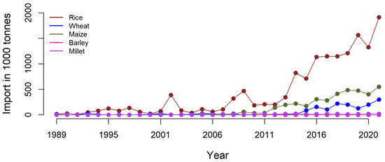 Due to the low productivity of the agricultural sector in Nepal, national production cannot meet the national food demand, and food imports are necessary to close the gap. Cereals are the most vital food for providing caloric and nutritional requirements and are the main low-cost source of energy and protein in Nepal. Figure 1 shows the import rates of the five main cereal crops in Nepal. The country went from being a net food exporter in the 80s to becoming an importer, with increasing import rates of on average 39% per annum for rice, 26% for maize, and 126% for wheat [12,13].