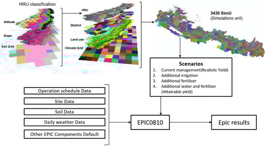 Flow chart of the methodological framework used for the yield gap analysis in Nepal, including homogeneous response unit (HRU) and simulation unit delineation, scenario portfolio, and input data to the EPIC crop model.