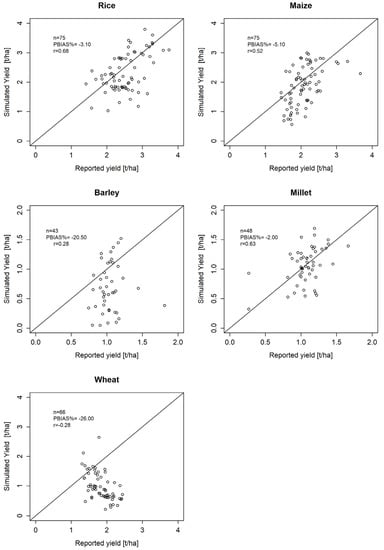 We simulated crop yields under reported management for the period from 1999 to 2014 on all simulation units. District, province, and national level crop yields were determined by aggregating the yields of all simulation units contained in the specific spatial boundaries. The simulated mean crop yields at the country level were lower than reported mean crop yields but in the same range: rice 2.3 vs. 2.59 t/ha (simulated/reported), wheat 1.07 vs. 1.94 t/ha, maize 1.87 vs. 2.15 t/ha, millet 1.06 vs. 1.08 t/ha, and barley 0.84 vs. 1.02 t/ha. At the district level, the same pattern was visible, with simulated yields slightly lower than reported yields in many cases but overall in the same range. PBIAS between reported and simulated mean annual yields was −3.1% for rice, −5.1% for maize, −20.5% for barley, −2% for millet, and 26% for wheat. According to these values, the calibration of millet, rice, and maize can be considered very good, and the calibration of barley and wheat unsatisfactory. The RE values vary between −33.02 and 36.8% (mean −14.08%) for rice, between −58.87% and 48.85% (mean −41.86%) for wheat, between −37.43 and 40.04% (mean −10.43%) for maize, between −48.37 and 48.29% (mean −1.90%) for millet, and between −58.95% and 37.12% (mean −22.62%) for barley. Except for wheat, all mean RE values fall into the range for ‘good’ RE values, but the range over the different districts shows that many RE values exceed this range, indicating unsatisfactory results. These outliers are also visible in the scatterplot of Figure 4, where we compare reported and simulated mean annual yields at the district level. The plot shows that there is a moderate agreement between simulated and reported values, with many outliers on both sides. For wheat and barley, a clear systematic underestimation of yields by the model is apparent.