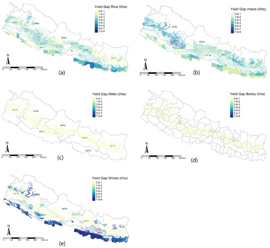 Simulated yield gaps of (a) rice, (b) maize, (c) millet, (d) barley, and (e) wheat in tons per hectare.