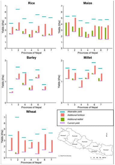 Rice, wheat, maize, millet, and barley are the five major staple cereal crops in Nepal. However, their yields are low, and imports are needed to meet domestic demand. In this study, we quantify the gap between current and potentially attainable yields in Nepal, estimate how much additional fertilizer and irrigation are required to close the gap, and assess if self-sufficiency can thus be achieved. For this, we first test the ability of the crop model EPIC to reproduce reported yields in 1999–2014 accurately. On average, simulated and reported yields at the national level were in the same range, but at the district level, the error was large, as the resolutions of the available climate and soil input data were not high enough to depict the heterogenic conditions in Nepal adequately. In the main study, we show that average yield gaps in Nepal amount to 3.0 t/ha (wheat), 2.7 t/ha (rice), 2.9 t/ha (maize), 0.4 t/ha (barley), and 0.5 t/ha (millet). With additional irrigation and fertilization, yields can be increased by 0.1/2.3 t/ha (wheat), 0.4/1.3 t/ha (rice), 1.6/1.9 t/ha (maize), 0.1/0.3 t/ha (barley), and 0.1/0.4 t/ha (millet), respectively. The results show that providing reliable and affordable access to fertilizer should be a priority for closing yield gaps in Nepal.