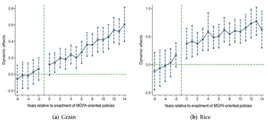 DD relies on the parallel trends assumption which requires that in the absence of treatment, the difference between the treatment and control group is constant over time [46]. Despite the estimated coefficients of treatment effects being statistically significant in the DD estimation, the parallel trends assumption might still be a cause of concern. One estimation strategy widely used is to implement an “event-study difference-in-differences” estimator (ET-DD) [48]. The ET-DD estimation can also show the dynamic effects of the MGPA policy on crop production if the parallel trends assumption is satisfied. The specification of the ET-DD estimation model is: