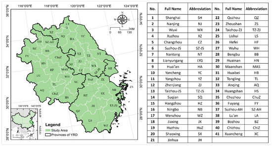 The Yangtze River Delta region is an alluvial plain formed before the Yangtze River entered the sea and located in the lower reaches of the Yangtze River in China, bordering the Yellow Sea and the East China Sea at the confluence of rivers and seas, with many coastal ports along the river. The Chinese government has not defined the geographical scope of the Yangtze River Delta in the same way at the different stages of development. The biggest change was found in the cities of Anhui, which was first invited to attend the Yangtze River Delta Key Leaders Symposium in 2008 but failed to become a real member of the Yangtze River Delta. Hefei and Maanshan attended the 2010 plenary meeting of the Yangtze River Delta Urban Economic Coordination Committee as regular members. In 2013, Wuhu, Chuzhou, and Huainan attended the plenary meeting, but Anhui’s application to be integrated into the Yangtze River Delta was not officially approved by the state at the time. In 2014, the central government issued the Guidance on Promoting the Development of Yangtze River Economic Belt by Relying on the Golden Waterway, which clarified at the national level that Anhui is an important part of the Yangtze River Delta. The central government released the City Cluster Development Plan in the Yangtze River Delta Region in 2016, bringing Hefei, Wuhu, Maanshan, Tongling, Anqing, Chuzhou, Chizhou, and Xuancheng in Anhui into the plan. In 2019, the central government published the Outline for the Regional Integrated Development of the Yangtze River Delta, which covered all cities in Shanghai, Jiangsu, Zhejiang, and Anhui. This paper studies the regional scope of the official plan for 2019, including 41 cities such as Shanghai, Nanjing, Hangzhou, and Hefei (Figure 1). In this paper, Taizhou in Zhejiang province is abbreviated as Taizhou-ZJ, Taizhou in Jiangsu province is Taizhou-JS, Suzhou in Jiangsu province is Suzhou-JS, and Suzhou in Anhui province is Suzhou-AH to avoid confusion.