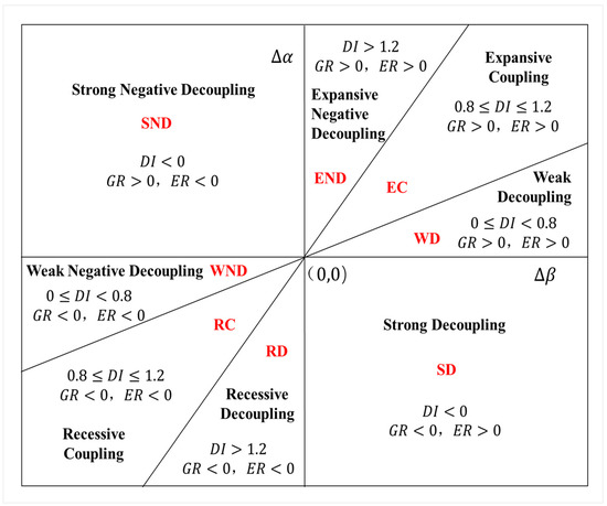 This paper uses a decoupling model to analyze the relationship between urban industrial land changes and manufacturing growth in the YRD to reveal the degree of the dynamic mismatch between the two. The decoupling is classified into 3 types and 8 sub-types based on whether and are positive or negative, with 0.8 and 1.2 as the thresholds for (Figure 3) [61,62]. Coupling stands for synchronous development, whereas decoupling and negative decoupling stand for asynchronous development, where the former represents efficient positive mismatching and the latter represents inefficient negative mismatching. SD represents a reduction in urban industrial land while manufacturing is growing, achieving reduced and efficient intensive use. On the contrary, SND represents expanding industrial land but shrinking manufacturing, indicating that land inputs are not creating the corresponding economic output and are in an inefficient negative mismatch. WD, RC, and END indicate that both urban industrial land and manufacturing are experiencing positive growth but that land use intensification is decreasing, and the relationship between them is gradually changing from positive mismatching to positive synchronization and negative mismatching. WND, EC, and RD indicate that urban industrial land and manufacturing are in a state of negative growth but that the land use intensity is increasing, and the two gradually shift from negative mismatching to negative synchronization and positive mismatching. It should be noted that EC and RD have not achieved sustainable development although they are in negative synchronization and positive mismatching with high land use efficiency.