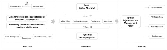 The first step is to analyze the evolution characteristics of urban industrial land. Firstly, GIS tools are employed to analyze the spatial patterns of industrial land in YRD cities. Secondly, the BCG matrix is used to analyze the trends in the spatio-temporal evolution of the land. Thirdly, Geodetector is used to analyze the influencing factors and their interactive effects on the allocation of urban industrial land in the YRD. The second step is based on the spatial mismatch model and decoupling index to analyze the degree of the mismatch between urban industrial land changes and the growth of manufacturing in four dimensions: added value, employed population, total assets, and gross profit, and includes static and dynamic studies. Notably, different weight combination schemes can be adopted depending on the differences in the values and goal orientations in the process of the overlay analysis of the different indicators. The third step is to develop spatial administration and management policies. Based on the results of the dynamic mismatch analysis, the solution and correction strategies for the spatial mismatches are proposed in combination with the values and goal orientations (Figure 4).