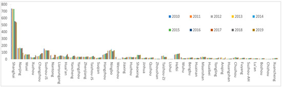 The data of value added, jobs, assets, and profits created per unit area of land help to better analyze the concrete implications of the allocation of urban industrial land on manufacturing and economic growth. The cities with the highest and lowest industrial added value per unit of area in 2010 were Guangzhou (33.74) and Lu’an (4.34) and in 2019 this changed to Wenzhou (146.09) and Xuancheng (9.33), with the average value increasing from CNY 1.421 billion in 2010 to CNY 2.803 billion in 2019. More than 90% of the cities experienced positive growth and some, including Wenzhou, Nanjing, and Wuhu, showed the biggest percentage jump. However, Huainan, Huaibei, and Tongling saw declines, especially Tongling, which declined by nearly half. The cities with the largest employed population per unit area in 2010 and 2019 were Hangzhou (1.71) and Wenzhou (2.12), whereas Xuancheng (0.02 and 0.08) was always at the lowest level. About 60 percent of the cities registered positive growth and the average value increased from 0.43 in 2010 to 0.52 in 2019. However, a decline was found in about 40% of the cities, especially Xuzhou, Hangzhou, Lishui, and Jinhua, indicating that their dependence on the population was decreasing along with the rapid transformation of mechanized and intelligent manufacturing. The cities with the highest and lowest manufacturing assets per unit area in 2010 were Guangzhou (107.47) and Anqing (10.04), respectively, and this changed to Wenzhou (210.94) and Huangshan (17.95) in 2019, with the average value increasing from CNY 3.866 billion in 2010 to CNY 6.321 billion in 2019. Positive growth was recorded in 82.93% of the cities, including Wenzhou, Nanjing, Hefei, Suzhou-JS, Hefei, and Wuhu, which saw the sharpest increases. However, 17.07% of the cities showed different degrees of decline, with large declines in Changzhou, Huainan, Maanshan, Huaibei, and Tongling, indicating that the positive effect of industrial land allocation on the accumulation of manufacturing assets was decreasing (Table 2).