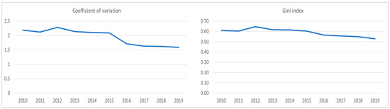 There was high spatial heterogeneity but low convergence. There was a huge disparity in urban industrial land area between the different cities from 2010 to 2019, with Shanghai leading the way and staying on top for a long time. Nanjing, Suzhou-JS, Changzhou, Hangzhou, Ningbo, and Hefei were in the second echelon, whereas Wuxi, Lianyungang, Huai’an, Yangzhou, Taizhou-JS, Shaoxing, Taizhou-ZJ, and Ma’anshan were in the third echelon, and were significantly different from the other cities. Wenzhou, Lishui, Zhoushan, Lu’an, Chizhou, and other cities had a small amount of industrial land, with Lishui having the smallest (Figure 5). Although the coefficient of variation and Gini index showed a downward trend from 2010 to 2019, they were still high, remaining above 1.55 and 0.53, which was far higher than the threshold values (0.36 and 0.4), indicating that the spatial heterogeneity of industrial land in YRD cities was high with weak convergence (Figure 6).