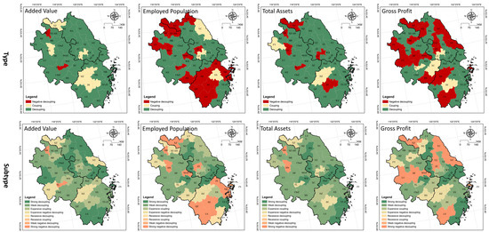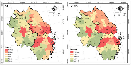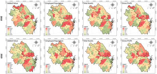 Most of the cities with the highest and high added values were clustered in southern and northern Jiangsu and central Anhui in 2010, and in the Shanghai–Nanjing development corridor and western Zhejiang in 2019. It is noteworthy that the contribution of Anhui decreased. The cities with the highest level of employed population were clustered in the Shanghai and Hangzhou metropolitan areas, and higher agglomerations were transformed from the coastal development belt of Zhejiang to the Nanjing metropolitan area, with the contribution of Anhui remaining constantly low. The cities with the highest total assets shifted from decentralized distribution in 2010 to clustering in the Shanghai–Nanjing development corridor in 2019, whereas the clustering area for the cities with the lowest total assets shifted from the south to the east of Zhejiang. The cities with the highest and high gross profits were clustered in the Shanghai–Nanjing development corridor and Hefei and Hangzhou metropolitan areas and expanded northward over time along the coastal zone of Jiangsu (Figure 11).