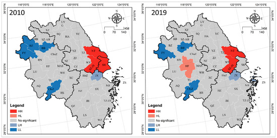 The global Moran’s I index in 2010 and 2019 was 0.07 and 0.08, respectively, which indicated that the distribution of urban industrial land had a positive spatial correlation and agglomeration. From the geographical distribution of HH cities, it was concentrated in the Shanghai metropolitan area in 2010 and then in only Suzhou-JS and Nantong in 2019. From the geographical distribution of LL cities, they have long been concentrated in Anhui province including Fuyang, Bozhou, Bengbu, Chizhou, etc. In 2010, there were no HL cities but Hefei was an HL city in 2019. Jiaxing was an LH city in 2010 and Zhoushan became an LH city in 2019. Overall, the geographical distribution of HH and LL cities had a local agglomeration, with Shanghai and its neighbors more likely to have high indices, whereas cities in Anhui province and its neighbors tended to have low values (Figure 8).
