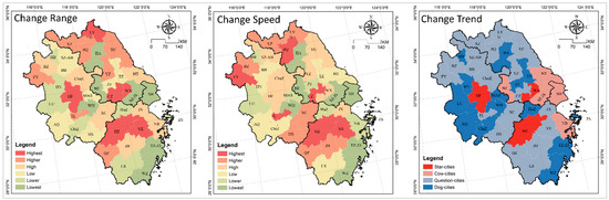 As for the range of the changes, most of the cities with the highest levels of change were concentrated in the Nanjing, Hangzhou, and Hefei metropolitan areas, and those with high levels were concentrated in the northern and coastal areas of Jiangsu province. The cities with the lowest levels of change were concentrated in the Shanghai and Wenzhou metropolitan areas and those with low levels were mostly concentrated in West Anhui province. For the speed of the changes, the cities with the highest and high levels were mainly concentrated in the junction of Zhejiang and Anhui provinces, the Huaihai economic zone, and North Anhui province, and those with the lowest and low levels were mostly concentrated in the Shanghai metropolitan area, the junction of Anhui and Jiangsu provinces, and the eastern region of Zhejiang province (Figure 9). It is worth noting that, affected by the economic transformation and development stage, the changes in YRD industrial land were increasingly differentiated. From 2010 to 2019, most cities maintained positive growth, especially Changzhou, Hangzhou, Shaoxing, and Hefei and other cities had strong expansion; however, Shanghai, Nanjing, Suzhou, Huai’an, Wenzhou, Huzhou, Zhoushan, Taizhou-ZJ, and Wuhu experienced varying degrees of decline.