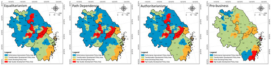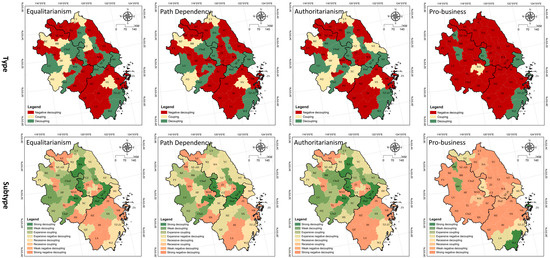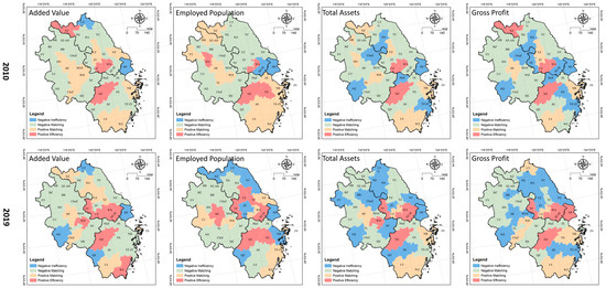 What should be noted is that there is a temporal hysteresis in the industrial land input to manufacturing output, and spatial mismatches in regional development are also difficult to completely avoid. Therefore, spatial mismatches have a limited and tolerable impact on the high-quality development of urban manufacturing, provided that they are kept within a certain range; however, if the spatial mismatches go beyond the maximum level that the region can bear, they will become an obstacle in the development of urban manufacturing and will have a greater negative effect on sustainable development. In this paper, cities with a positive spatial mismatch index are defined as positive mismatching, whereas those with a negative spatial mismatch index are defined as negative mismatching. The mean values of positive and negative are calculated, respectively, and are used as the thresholds for classifying the YRD into four types of zonings: negative inefficiency, negative matching, positive matching, and positive efficiency. Negative and positive matching indicates that the level of the spatial mismatch is still within a reasonable range and still has a small impact on the development of urban manufacturing. Negative inefficiency shows that the consumption of industrial land for the development of urban manufacturing is much higher than the national average, with extensive and even wasteful land use, meaning it is in the worst possible state. On the contrary, positive efficiency indicates that the land consumption is much lower than the national average, with intensive and efficient land use, meaning it is already in an optimal state.