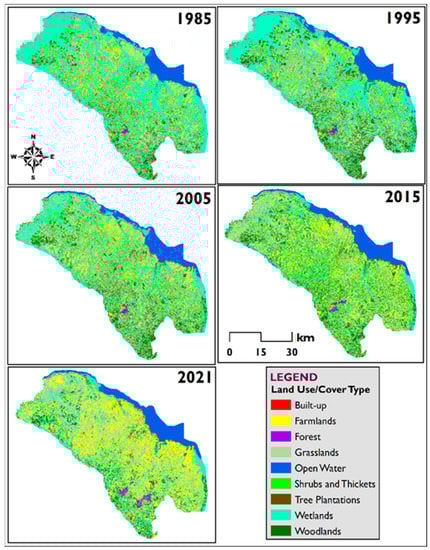 Satellite images for 1985, 1995, 2005, 2015 and 2021 for Nakasongola district were downloaded from the USGS Earth explorer website (https://earthexplorer.usgs.gov/, accessed on 15 January 2022).