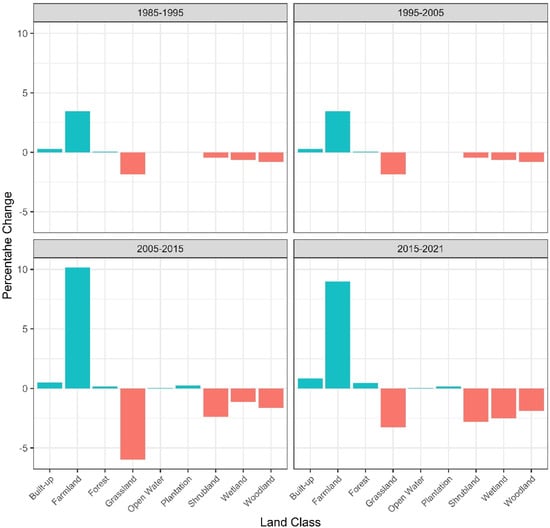 The results showed that there were gains in farmland, built-up, central forest reserves and tree plantations while losses were observed in woodland, shrub and thicket, grassland and wetland cover (Figure 3). Between 1985 and 2021, the total land area under grassland registered a net decline of −13.3%, shrub and thicket −8.3%, woodland −5.2% and wetland −4.8%. Farmland increased by 28.6%, built-up area by 1.7%, central forest reserves by 0.6% and open water by 0.1% (Figure 3).