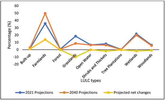 The current nine LULC types observed in the rangelands of Nakasongola district are projected to change (Appendix C, Table A3). The largest part of Nakasongola district (49.7%) is likely to be covered by farmlands in 2040 (Figure 4). Land under grasslands, open water, shrubs and thickets and woodlands cover will all have decreased by the year 2040. The largest decline (−9.89%) will be observed in grassland cover, while farmlands will increase by 13.85% (Figure 5).
