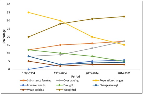 Responses from the local community revealed a total number of nine perceived drivers of LULC change in the rangelands of Nakasongola district between 1985 and 2021 (Figure 6). The change in the local population (35%) was perceived as the biggest contributor of LULC changes for the period 1985994. This was followed by the increase in wood fuel extraction (20%), subsistence farming (12%) and drought (12%). Between 1995 and 2004, changes in the population (30%), wood fuel extraction (28%) and subsistence farming were still the drivers of LULC changes in this area. Within the period 2005–2014, wood fuel extraction (31%) was perceived to have emerged as the leading driver of LULC changes in the rangelands of Nakasongola district followed by the local population changes (20%), the rise in subsistence farming (20%) and livestock grazing rates (13%). In the more recent period of 2014–2021, the dominant drivers of LULC changes in the rangelands of Nakasongola district were perceived to be the increased rates of wood fuel extraction (32.5%), overgrazing (17.2%) and subsistence farming (17.2%). Other factors included increased drought occurrences, increased invasive-plant weeds, weak government policies and change of rangeland management regimes from communal ownership to private ownership.