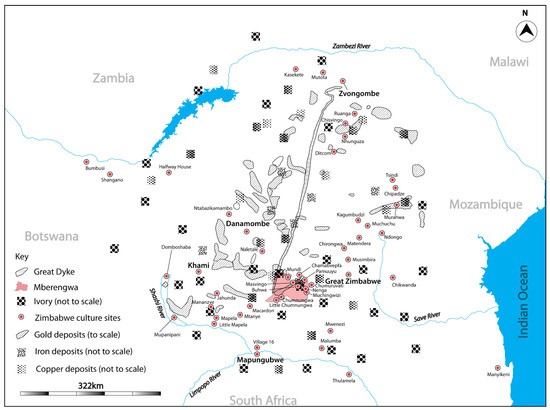 Whilst researchers working in southern Africa have made huge strides towards developing models of how Iron Age societies related to nature during the last two thousand years (i.e., [3,8,11,13,14,15,16,17,18,19,20,21,22,23,24,25,26,27]), some challenges remain regarding the imbalance in research coverage and unavailability of well-resolved datasets. Usually, much of the scholarship on land use in the region is discussed in the context of human geography, agriculture, or earth sciences along with modern rural and urban societies (i.e., [28,29,30]). More importantly, there is a limited appreciation among archaeologists of the potential of archaeology in contributing meaningfully to these conversations despite the archaeological record being replete with valuable information that gives a long-time depth of past human land use practices. Rather, most of the scholarly effort has been invested in building culture-historical sequences of various Iron Age societies that populated the region (see [31,32,33,34] for critique). Whilst there is no doubt that scholarly coverage of these issues has enriched our understanding of the expansion of the Bantu, the contribution of the physical environment towards the development of complexity over time remains poorly understood, especially in gold belt territories dotted across southern Zambezia (Figure 1) that were previously relegated as provincial districts of the Zimbabwe culture (CE 1000–1900) civilizations such as Mapungubwe (CE 1055–1400), Great Zimbabwe (CE 1300–1660), Khami (CE 1250–1685), Mutapa (CE 1450–1900), and Danamombe (CE 1685–1900) [35,36,37,38,39,40,41,42,43]. Consequently, we do not know much about the Zimbabwe culture societies that inhabited these gold belt territories, particularly how they adapted their everyday lives to achieve sustainability in the long and short-term perspectives. Such an inquiry enables us to explore how these Iron Age societies exploited the local resources, particularly those that had gold and other mineral deposits at their disposal.
