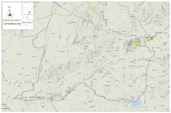 Datasets informing this study were largely drawn from the archaeology of Zimbabwe tradition societies that lived in ancient Mberengwa, including the history and anthropology of their Shona descendants who largely occupy most parts of southern Zambezia. Published and unpublished reports of surveys and excavations undertaken in the last century by both professional and amateur archaeologists largely informed the archaeology. However, for ground truthing purposes and augmenting the irregularities in the existing spatial and material culture datasets, we also carried out our own fieldwork. This included inter and intra-site surveys, which we executed instantaneously using a combination of satellite imagery (Google Earth Pro and Esri’s web-based ArcGIS Online), and pedestrian and vehicular surveys to map the sites (and their surface deposits) and plot their distribution and catchment areas in relation to the geology, climate, soils, and vegetation cover of Mberengwa (Figure 3). We also inventoried relevant archaeological finds that were recovered by the previous excavators. This included excavation data from recent fieldwork at Chumnungwa (see [77]), which provided additional insights into the settlement history and technological aspects. Generally, the archaeological data were useful in the reconstruction of the land use behaviors of the Zimbabwe people across the sites and the broader surrounding landscapes. However, because of the legacy of colonial and postcolonial vandalism that resulted in the partial and complete destruction of some sites by mining corporations, land developers, local villagers, artisanal miners, treasure hunters, and antiquarians who unscientifically dug sections of these places in search of gold and other valuable finds (see [36,38,77,78]) (as well as massive post-depositional processes mainly characterized by soil erosion and the intrusion of modern settlements and crop farming into some of the archaeological landscapes), it was difficult to achieve this. Therefore, recourse was made to Shona anthropology (i.e., [79,80,81,82,83,84,85,86,87,88,89,90]) and history [31,91,92,93,94,95] to make meaningful inferences that are conversant with the local epistemologies, ontologies, and practices of land use. As such, the next section explores the archaeology of Zimbabwe tradition societies that inhabited ancient Mberengwa.