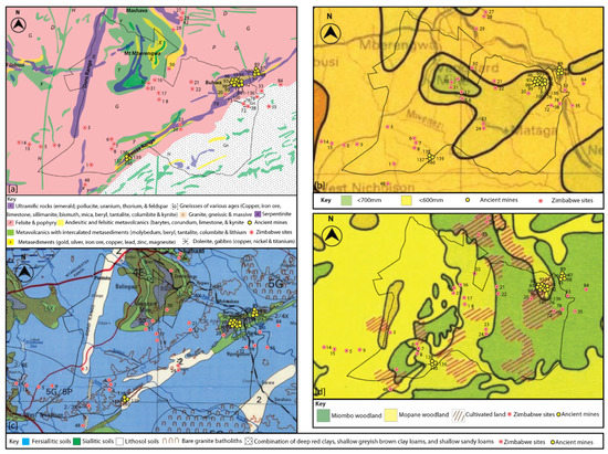 Bio-physiographic maps of the landscape in and around Mberengwa showing the distribution of Zimbabwe tradition sites and ancient mines in relation to the (a) geology (adapted from [55]); (b) mean annual rainfall patterns (adapted from [56]); (c) soil classes (adapted from [57]); and (d) vegetation types (adapted from [58]).