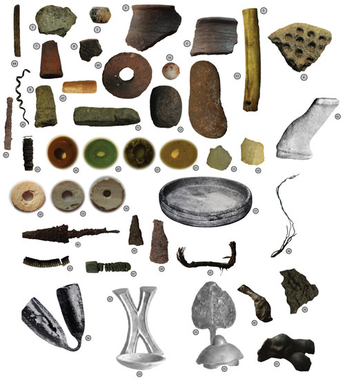 Some of the crafts and import objects that were recovered from Zimbabwe tradition sites in Mberengwa. 1 = soapstone slab, 2 = soapstone bead, 3–4 = Zimbabwe tradition pottery sherds, 5 = bone whistle, 6 = clay gold bead mold, 7–8 = clay figurines, 9–10 = spindle whorls, 11–16 = lithics, 17 = soapstone bowl (originally from Great Zimbabwe; typical bowls were recovered at Chumnungwa and Mundi), 18–20 = shell beads, 21–24 = glass beads, 25 = bronze wire bangle with hollow bone core, 26, 28 = cuprous wound wire, 27 = Mbira iron key, 29–31 = slag, 32 = clay (pot) lid, 33, 38, 39 = iron hoe heads, 34, clay bowl, 35 = copper X-shaped ingot, 36 = double iron gong (originally from Great Zimbabwe; a similar gong was recovered at Chumnungwa), 37 = bronze wound bangle with a fiber core, 40 = iron arrowhead fragment, 41–42 = bronze wound wire bangles, 43 = dice, 44 = bronze bangle fragment with herringbone pattern, 45 = soapstone hammer (adapted from [35,36,38,77,105]).