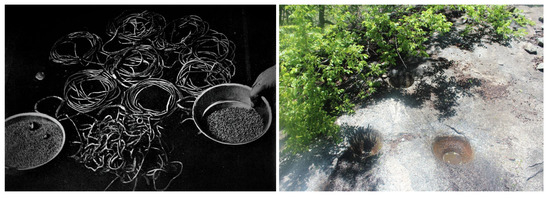 The abundance of ancient mines suggests mining to have been widely practiced across the Mberengwa landscape. As demonstrated by the survey data (Figure 3), most of the Zimbabwe settlements were strategically positioned in close proximity to the greenstone belts that host these ancient mines. These interlayered greenstone belts, including Mberengwa, Buhwa, Filabusi, and Mweza, are richly embedded with a range of minerals [50,51,52,53,54,55]; hence, there is a high probability that they were exploited by the Zimbabwe people for iron, copper, and gold ore. The prevalence of open shafts with heavily eroded soil mounds suggests open mining to have been widely used to extract these ores from the ground. This method of mining was widely used in precolonial southern Africa, including regions such as Musina in Limpopo [128] and Dukwe and Thakadu in northeastern Botswana [101,131]. However, given the abundance of hematite, especially in Buhwa, there is also a likelihood that ores could be easily collected as surface deposits [100]. Moreover, alluvial gold panning could be undertaken in local river channels with gold deposits, including the confluence of Ngezi and Runde (Figure 2).