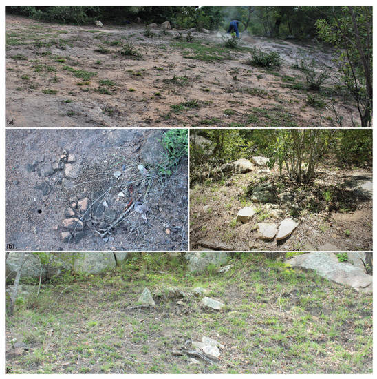 The adjacent lands outside the settlements were probably used as fields (minda) for crop cultivation. The available data from the surveys show that the bulk of open tracts of land encircling most of the Zimbabwe settlements are arable and comprise brownish and reddish-brown soils (Figure 3). These Fersiallitic soils are a product of the disintegration of gneisses and granitic rocks, and their textures vary from coarse to fine-grained [57,58,59,60,61,62,65]. Despite having a low water-retention capacity that is susceptible to erosion and high infiltration, these soils are regarded as good for the cultivation of cereals and legumes [38,62,63,65,68]. As we discussed earlier, there is direct archaeological evidence of grain storage facilities at some Zimbabwe settlements in Mberengwa, including Kongezi and Chumnungwa (Table 1). In addition, cultivable land is conventionally regarded by most scholars to have been part of the top priorities for most Iron Age communities that inhabited southern Zambezia since they were sedentary food-producing societies that thrived on economies that largely depended on rain-fed agriculture [31,77,92,105,108,112]. The picture emerging from oral traditions [37,38,65,68,93] shows that each settlement in precolonial Mberengwa had a piece of land whereupon families cultivated a range of crops such as sorghum (mapfunde), pearl millet (mhunga), and finger millet (rukweza) for daily subsistence. The rainfall received in both the Middleveld and Lowveld sections of Mberengwa was probably adequate to sustain the cultivation of these drought-tolerant crops since they do not require more than 300 mm to mature. Although, this might have been difficult in times of drought, as little precipitation would be received in most places due to the high frequency of climatic oscillations caused by El Niño [64,68]. Nevertheless, elevated places such as Mt Buhwa possibly effected orographic rainfall, which was brought inland by the monsoon winds rising from the Indian Ocean [40,64]. As we denoted among the contemporary agropastoralists that inhabit Mberengwa, they are used to these climatic oscillations; hence, they have cropping mechanisms that enable them to yield bumper harvests from the available rainfall. For instance, they adjust their planting season in tandem with the first rains, locally known as gukurahundi, to ensure a successful harvest [63,113]. Thus, given the historical connection between the Shona societies currently inhabiting Mberengwa and the Zimbabwe culture [40,63,66,91], it is plausible to envision the arable lands situated close to the Zimbabwe tradition settlements as ancient fields that were used for cultivating a range of cereals and legume species such as sorghum and beans. However, during the off-season, there is a possibility that the fields (minda) were used as a snaring ground for catching red veld rat/mice (mbeva) represented by Chumnungwa fauna by digging up their burrows (mwena) [114,115].