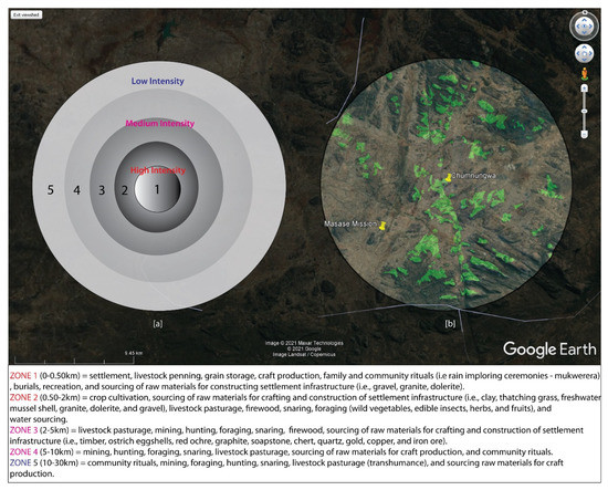 (a) Mixed land use categories within a 30-km radius modelled at the Zimbabwe sites in Mberengwa using a combination of archaeological, anthropological, and historical datasets (see Appendix A) (after [8,9]). (b) Catchment area (green sheds) of Chumnungwa within a 10-km radius (modelled using Google Earth Pro Viewshed 360-degree view).