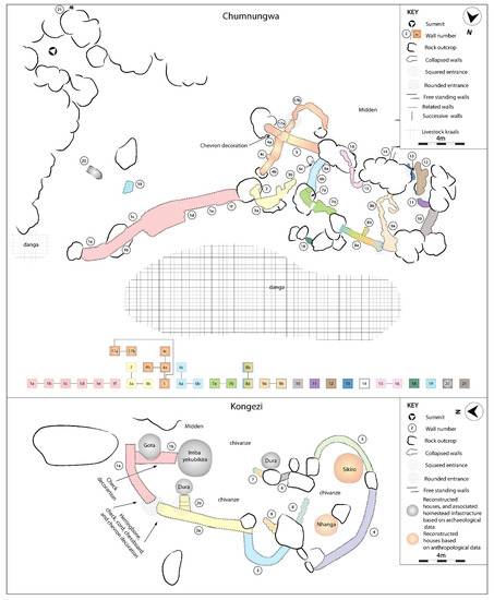 Above is the site map of Chumnungwa showing the construction affinity of the dry-stone walling modelled using Harris Matrix 2 and various features recorded onsite. Below is the site layout of Kongezi showing reconstructed houses and associated settlement infrastructure based on the archaeology, history, and anthropological datasets.