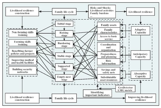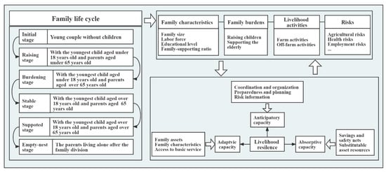 - Identifying the key factors of livelihood resilience can help managers to integrate existing resources and formulate effective livelihood resilience improvement policies for vulnerable groups. Some scholars have attempted to explore the influencing factors of livelihood resilience. For instance, Ado et al. [] studied influencing factors of farmers’ resilience to food security in the Aguie district of Niger and showed that family size, agricultural production and agricultural experience were the most important determinants of farmers’ resilience to food security. Li et al. [] revealed that education investment, social network, family burden ratio, and family size were the major factors that influenced the livelihood resilience of relocated migrants in China. Wen et al. [] revealed that savings, per capita income, educational investment, educational level of household head, as well as social networks, were the core factors that influenced the resilience of households on the Loess Plateau in China. These pieces of literature have directly or indirectly confirmed the significant impacts of household characteristics and related factors on livelihood resilience, which are closely related to the family life cycle. The concept of family life cycle (FLC) was first proposed by Rowntree [], which refers to the process of birth, development and disappearance of a family []. At present, the impact of FLC on smallholders has attracted the extensive attention of scholars. The existing literature mainly focused on the relationships between FLC and farmland management scale [,,], smallholders’ farmland transfer behaviors [], livelihood strategy [,], rural labor transfer [], and multidimensional poverty [,]. They explicitly or implicitly reflected that there were differences in capital accumulation, family size, dependency burden, livelihood risks and livelihood strategies of a household as the evolution of FLC [,], which lead to different livelihood resilience levels. However, there are few related studies. Therefore, this study attempts to explore the influencing factors of smallholders’ livelihood resilience from the perspective of the FLC, which helps stakeholders to understand the research mechanism of livelihood resilience, and provide references for local governments and managers to formulate targeted resilient livelihood measures.