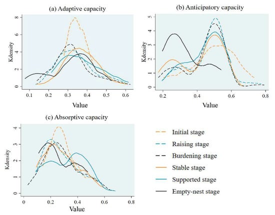 Figure 3 shows the kernel density distribution of the adaptive, anticipatory and absorptive capacities. In terms of adaptive capacity, the curve of kernel density of the supported stage was relatively flat, indicating that data of that stage fluctuated greatly. The kernel density curves of the other stages were steep, especially in the initial stage, suggesting that the data distributions were concentrated. As for anticipatory capacity, the kernel density curve in the initial stage was flat, with values that largely fluctuated. The peak value in the empty-nest stage showed a left bias, which revealed that the anticipatory capacity of most families at this stage was small. In addition, the curve in the supported stage showed a steep trend, indicating that the anticipatory capacity of most families was concentrated in the mean value. As far as absorptive capacity was concerned, the kernel density curves of the supported stage and empty-nest stage showed a bimodal distribution, indicating that the absorptive capacity of farmers at this stage showed a polarization trend. The density curves of the other stages were steep with left-biased peaks, indicating that the absorptive capacity of most smallholders was small.