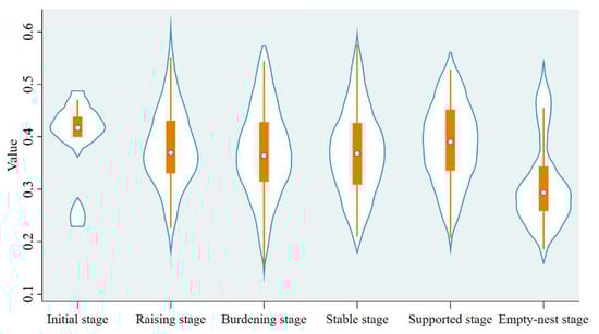 The results of one-way ANOVA also showed (Table 2) that the livelihood resilience of smallholders at different stages of the FLC was significantly different at the 5% level, which had an average value of 0.372, a maximum value in the initial stage and a minimum value in the empty-nest stage. Figure 4 showed the violin diagram of livelihood resilience in every stage. The box of livelihood resilience of farmers in the initial stage is close to the upper section, indicating that the livelihood resilience in this stage was high. The livelihood resilience in the empty-nest stage was narrow at the top and wide at the bottom, which revealed that the livelihood resilience in this stage showed low-value distribution. Livelihood resilience in the raising stage was close to the lower quartile, which showed a lower livelihood resilience in this stage. During the supported stage, on the contrary, the livelihood resilience was wide at the top and narrow at the bottom, indicating that the resilience of most farmers was high.