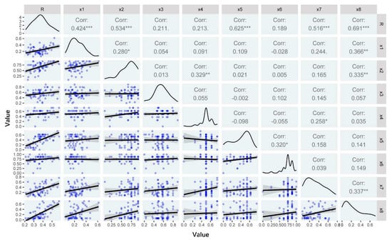 In order to compare and analyze the result consistency of the GeoDetector model and LMG metric, we took the data of smallholders in the stable stage as an example to draw the bivariate correlations between livelihood resilience and the eight dimensions (Figure 5). The results showed that smallholders’ livelihood resilience was strongly correlated with family assets (X1), family characteristics (X2), preparedness and planning (X5), savings and safety nets (X7) and substitutable asset resources (X8).