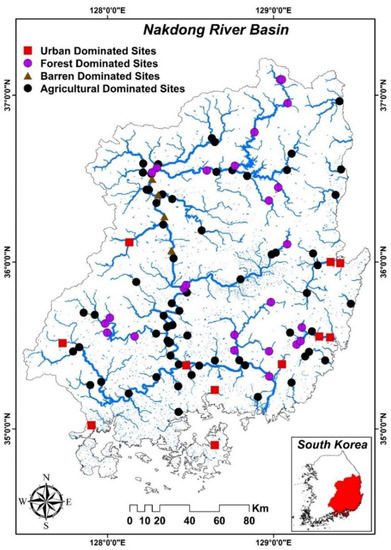 The Nakdong River basin, which comprises 25% of South Korea’s total land area, begins in the Taebaek Mountains in Gangwon Province and runs through Gyeongsangbuk Province, Daegu Metropolitan City, Gyeongsangnam Province, Busan Metropolitan City, and Ulsan Metropolitan City. The Nakdong River basin is South Korea’s second largest watershed. The watershed is 23,817.3 km2 in size, with a channel length of 521.5 km and a circumference of 1097.13 km. The average slope is 32.26%. To determine the effects of land cover type on the Nakdong River basin, we classified study sites into four categories: predominantly urban, forest, barren land, and agricultural (Figure 1).
