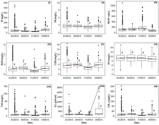Land cover-dominated site variations in water quality variables in the Nakdong River basin. AGRDS: agricultural coverage-dominated sites, BARDS: barren coverage-dominated sites, FORDS: forest coverage-dominated sites, URBDS: urban coverage-dominated sites. (I) TP: total phosphorus, (II) TN: total nitrogen, (III) TN:TP: total nitrogen and total phosphorus ratios, (IV) BOD: biological oxygen demand, (V) COD: chemical oxygen demand, (VI) DO: dissolved oxygen, (VII) TSS: total suspended solids, (VIII) EC: electrical conductivity and (IX) CHL-a: chlorophyll-a. The red dots indicate the mean value in all of the figures, the first highest mean receives the letter “a”, the second and third highest mean receives the letter “b”, and “c”, respectively, and means with no significant difference receive the same letter).