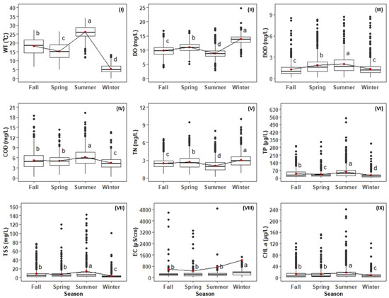 Seasonal variations in water quality parameters in the Nakdong River basin. Spring: March–May, Summer: June–August, Fall: September–November, Winter: December–February. (I) WT: water temperature, (II) DO: dissolved oxygen, (III) BOD: biological oxygen demand, (IV) COD: chemical oxygen demand, (V) TN: total nitrogen, (VI) TP: total phosphorus, (VII) TSS: total suspended solids, (VIII) EC: electrical conductivity and (IX) CHL-a: chlorophyll-a, The red dots indicate the mean value in all of the figures, the first highest mean receives the letter “a”, the second, third and fourth, highest mean receives the letter “b”, “c”, and “d”, respectively, and means with no significant difference receive the same letter).