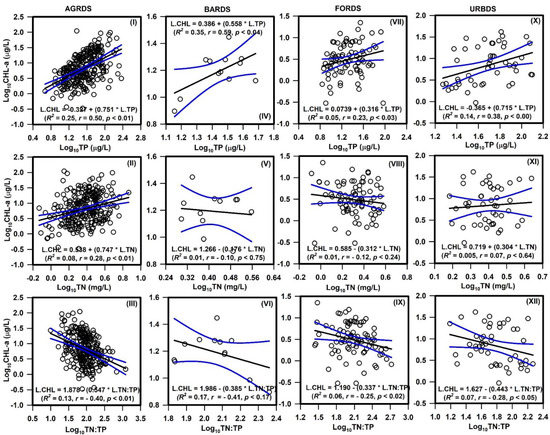 Influence of total phosphorus (TP), total nitrogen (TN), and TN:TP ratios on algal chlorophyll (CHL-a) in the Nakdong River basin. (AGRDS: agricultural coverage-dominated sites—(I–III), BARDS: barren coverage-dominated sites—(IV–VI), FORDS: forest coverage-dominated sites—(VII–IX), URBDS: urban coverage-dominated sites—(X–XII).