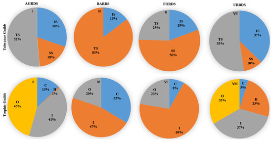 Trophic and tolerance guild variations at different land cover-dominated sites in the Nakdong River basin. SS: sensitive species, IS: intermediate species, TS: tolerant species, O: omnivores, I: insectivores, C: carnivores, and H: herbivores. (AGRDS: agricultural coverage-dominated sites—(I,II), BARDS: barren coverage-dominated sites—(III,IV), FORDS: forest coverage-dominated sites (V,VI), URBDS: urban coverage-dominated sites—(VII,VIII).