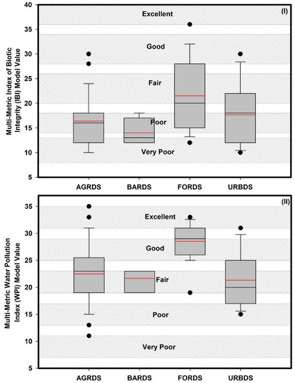 Biological and chemical health assessments at different land cover-dominated sites in the Nakdong River basin. (I) index of biotic integrity (IBI) model and (II): multi-metric water pollution index (WPI). AGRDS: agricultural coverage-dominated sites, BARDS: barren coverage-dominated sites, FORDS: forest coverage-dominated sites, URBDS: urban coverage-dominated sites (red lines in the box indicate mean value).