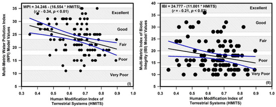 Relations of human modification index of terrestrial systems (HMITS) with chemical and biological health in the Nakdong River basin. (I) Influence of HMITS on the multi-metric water pollution index (WPI) model and (II) influence of HMITS on the index of biotic integrity (IBI) model.