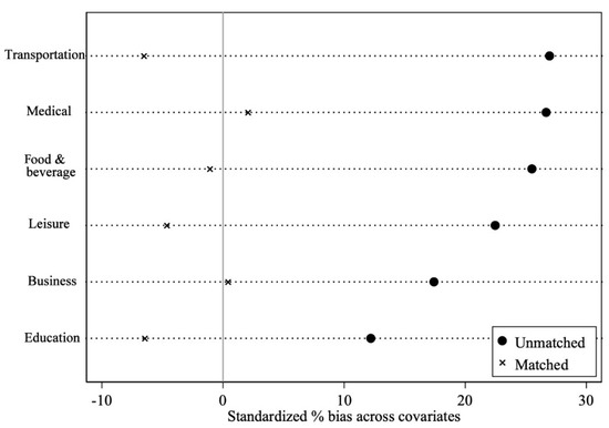 According to the results of the balance test of PSM (Figure 2), the absolute values of %bias for all covariates were less than 10%, and all of the values were significantly smaller than the bias before matching; the absolute values for the biases were also significantly lower than those before matching. These results indicate that for the covariates, the values between the experimental and control groups after matching do not differ, and the original hypothesis that “there is no systematic bias in the values of the covariates between the two groups” is not rejected, indicating that the samples are matched well, and the screening of “whether to carry out urban renewal” is effective.