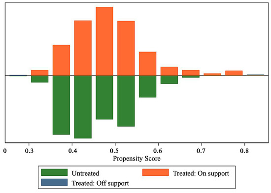 The results for the common support hypothesis test of the PSM (Figure 3) show that the vast majority of samples in the treatment and control groups are within the common range of values, while very few samples are not within the common range and the propensity score values are more extreme, thus confirming the robustness of the PSM results.