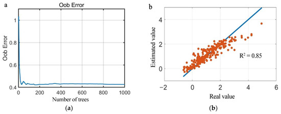 In the study, 1000 trees were selected for RF regression. The correlation coefficient reached 0.85, which means that RF regression was fit for purpose (Figure 4). The out-of-bag data were stable below 0.5 after the number of trees exceeded 100, indicating that the error for the model was small.