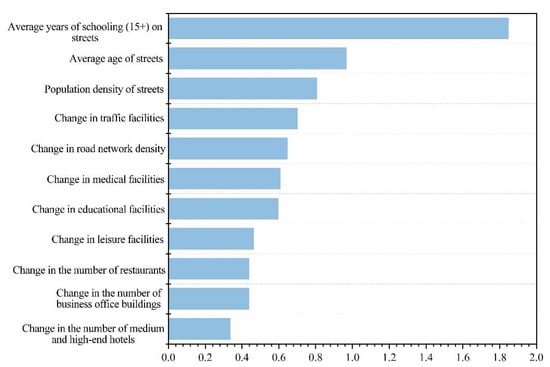 According to the results for the Gini impurity (Figure 5), the scores for importance for each indicator were obtained. The average years of education (students of 15 years and above) living in the streets, the average age of people living in the streets, the population density for the streets, the number of changes made to the traffic facilities, and the density of the road networks ranked in the top five factors (in the order given), with the Gini impurity exceeding 0.7, indicating the highest importance for the indicators. In particular, the indicator for the average number of years of education has a Gini impurity of 1.85, which is the most important indicator. These results indicate that the demographic characteristics and the degree of improvement of road traffic facilities around urban renewal projects contribute the most to the housing premium.