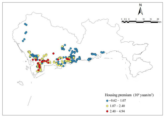 The dominant factors revealed by the RF model based on the machine-learning algorithm were input to the Geo-detector for analysis of the factors that influence the results. Based on the operational results of the PSM-DID model on 300 samples, it was possible to effectively exclude the interference of non-urban renewal factors around the housing for 300 samples, which were distributed in the Nanshan, Futian, and Luohu districts of Shenzhen. The average value of the urban renewal, which drove the premium generated by local housing from 2010 to 2018, was 12,100 yuan/m2. According to the natural breakpoint method, the housing premiums may be divided into three classes: high premium (24,000–49,400 yuan), medium premium (2400–10,700 yuan), and low premium (−0.62–10,700 yuan). The spatial distribution pattern for the premium effect on housing for urban renewal in Shenzhen (from 2010 to 2018) is shown in Figure 6, and this was used as a basis for the Geo-detector analysis of the impact factors.