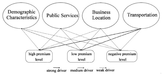 Based on the above analysis, a framework for the driving mechanism for the variation of housing premiums in the context of urban renewal was constructed (Figure 7). The variation of the housing premiums in urban renewal was mainly influenced by a combination of factors, i.e., population characteristics, public services, commercial location, and transport. The dominant factors for the “population characteristics” dimension are the average age of the population, the years of education, and the population density in the street(s) where the urban renewal project is located. The leading factors for the “location of public services” dimension include the growth of leisure, education, and medical facilities within a distance of 0.5 km from the site of the urban renewal project. The leading factor in the “commercial location” dimension includes the growth in the number of medium and high-end hotels, business offices, and restaurants in the vicinity. The leading factors concerning the “location of transport” dimension are the growth in the number of transport facilities and the improvement in the road network density. The drivers may be classified into three levels: a strong driver, a medium driver, and a weak driver, according to the differences in the degree of their impact on the housing premiums. Among them, the strongest driver for achieving a high premium on house prices is the location of transport, while the remaining factors constitute weak drivers. The strong and medium drivers for the low premium level are the location of transport and overcrowding, while public services and the location of commercial organizations are weak drivers at this level. The basic drivers of urban renewal on housing at negative premium levels are all weak drivers.