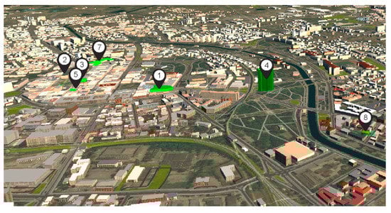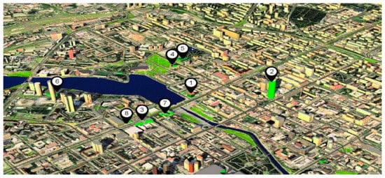 The direct link between a harmonious city environment and the positive attitude of the population towards their home city is becoming increasingly clear. This attitude serves as a source of sustainability for the city. It is determined not only by specific places and objects and their placement in the urban environment, but also by the kind of social interaction that these spaces create [,,,,]. In each of the analyzed cities, the leading positions in the imaginations of generation Z students are central squares, which are open spaces surrounded by historical buildings. The urban interiors of these places have been developing for a long time and have become a hallmark of each city, one of the key elements of its individuality. These spaces are formed by buildings of different epochs, styles and materials, small architectural forms, as well as seasonal retail outlets, with elements of the landscape changing from year to year. They are of interest for young people as locations for meetings, social gatherings, and various leisure activities. Such a preference for a certain location increases the importance of the place in the eyes of young people (creating memories, increasing the degree of involvement in city life) and in the eyes of the city administration (as an obvious indicator of the popularity of the place). These places of action convert the cities we live in into living works of art, where all citizens can interact and fully engage in the process of urban design and development [,,].