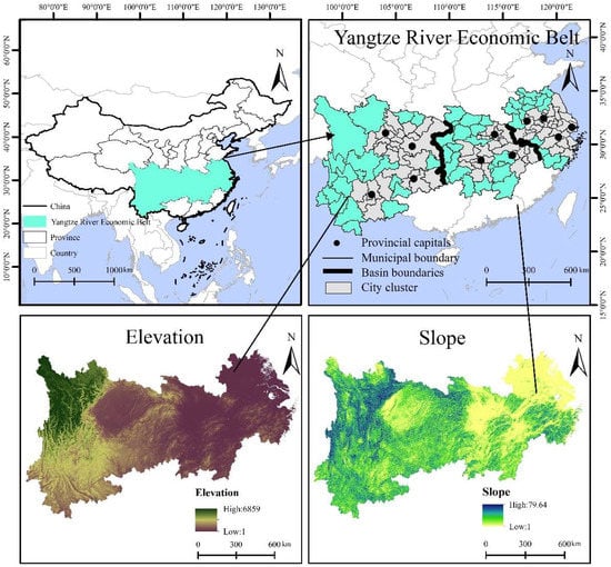 The YREB spans 21°08′ N to 35°20′ N, 97°21′ E to 122°25′ E. The region runs through the southeastern margin of the Qinghai-Tibet Plateau, the Yunnan-Guizhou Plateau, and the hills south of the Yangtze River from west to east, as well as the Sichuan Basin, the Lianghu Plain, the Poyang Lake Plain, and the middle and lower reaches of the Yangtze River. The terrain is high in the west and low in the east (Figure 1). It encompasses a vast territory, is rich in natural resources, and features complex terrain. In terms of elevation, the YREB decreases gradually from the upper reaches to the lower reaches, with the highest point in the upper reaches at 6511 m above sea level. The topography of the upper reaches mainly features highland and high mountains, with some basins and hilly areas at lower elevations. From the upper reaches, the elevation decreases along the east direction to the middle reaches, where mountains and hills dominate, with the highest elevation being about 3002 m. The lower reaches are generally flat, with plain terrain dominating, and the elevation is mostly below 50 m. In terms of slope, the whole area shows the spatial characteristics of a gradually decreasing overall slope from the upper reaches to the lower reaches, with areas of higher slope density being contiguous in the western part of the upper reaches and areas of the lower slope being distributed throughout most of the middle and lower reaches and near the Sichuan Basin of the upper reaches. According to the characteristics of the natural geographic environment in the study area, we used ArcGIS 10.2 (It is a new generation GIS software developed by ERSI (Environmental Systems Research Institute.) software to extract topographic factors, such as elevation and slope for topographic gradient analysis and combined this data with related studies [30]. With reference to the relevant criteria [31], we divided elevation and slope (Table 1).