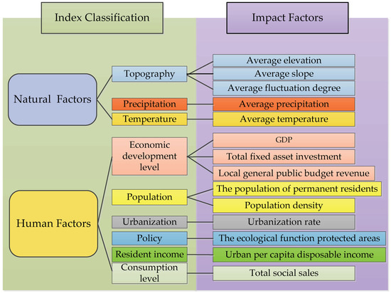 We selected 14 aspects of independent variables based on the relevant literature [33] and according to the study area’s natural geographical basis and socioeconomic factors, namely, the ecological function protected areas (X1), average elevation (X2), average precipitation (X3), average slope (X4), average fluctuation degree (X5), the average temperature (X6), GDP (X7), the population of permanent residents (X8), population density (X9), the urbanization rate (X10), urban per capita disposable income (X11), total fixed asset investment (X12), local general public budget revenue (X13), and total social sales (X14). These indicators fall into two categories. One reflects the state of the natural environment, involving topography, temperature, and precipitation. The other type reflects human factors, summarizing population, urbanization, policy, consumption level, and economic development. They are closely related to territorial space development and profoundly influence the distribution and evolution of space (Figure 2).
